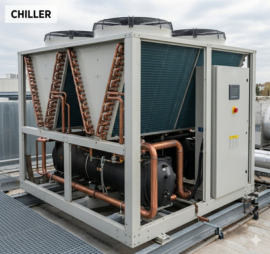 Standart soğutma cihazları genellikle kapalı bir hacmin havasını soğutmak için kullanılırken; Chiller sistemleri, bir sıvıyı (genellikle su veya glikol karışımı) soğutarak bu sıvının borular aracılığıyla üretim hatlarına veya klima santrallerine taşınmasını sağlar. Chiller sistemleri, özellikle büyük ölçekli tesislerde ve hassas proses soğutmalarında yüksek kapasiteli çözümler sunar.
